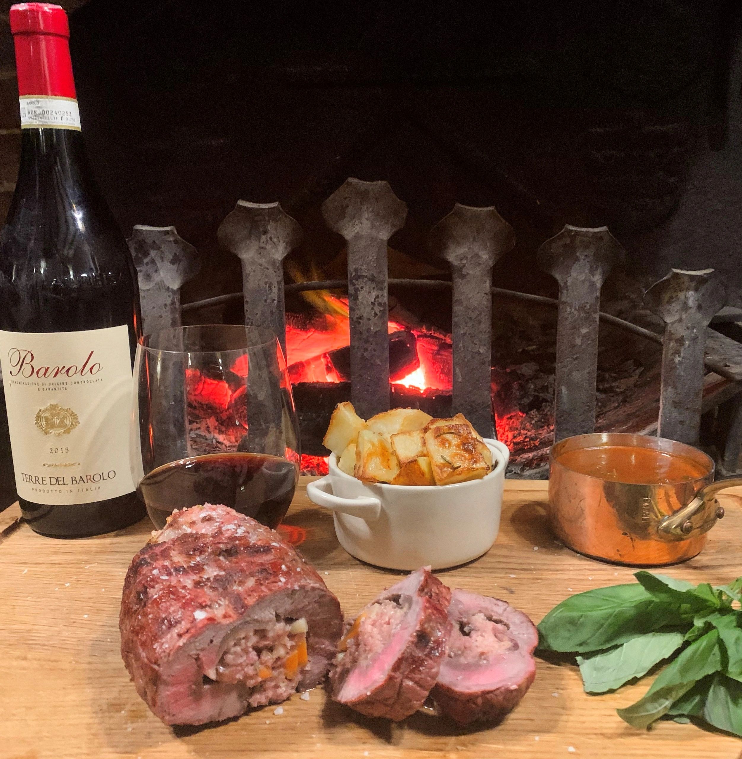 A top sirloin is butterflied and stuffed with veal or pork mince and other Italian ingredients and smothered with a red pasta sauce.