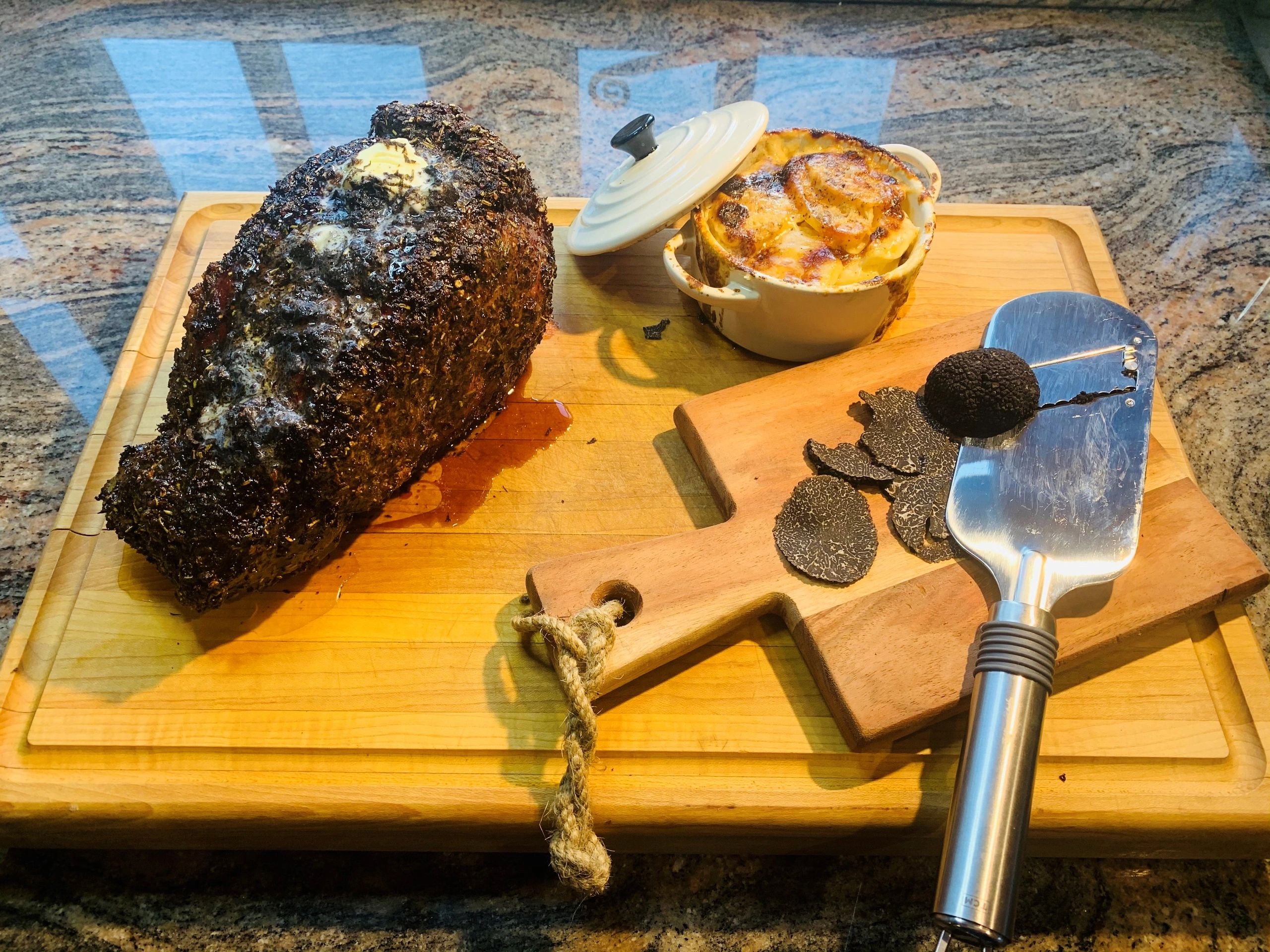 7. For a little more decadency grate some more black truffle directly over the sirloin before carving. Serve with gratin dauphinoise potatoes and grilled asparagus.