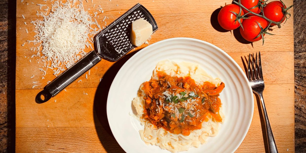 12. Meanwhile, set the rabbit ragù back over a medium heat. When the pasta is ready, drain it and top with the ragù. Toss until any water has been absorbed and the pasta is well-coated with the sauce. Serve with a generous shavings of Parmesan.
