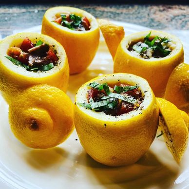 1. Slice each lemon 2 cms from the top making a lid for each lemon. Also slice the bottom on the lemon so that it can stand up on the barbecue making sure that that you do not puncture the core so that the ingredients do not leak. Using a knife, cut round the edge of the lemon and scoop out the inside being careful not to pierce the base.