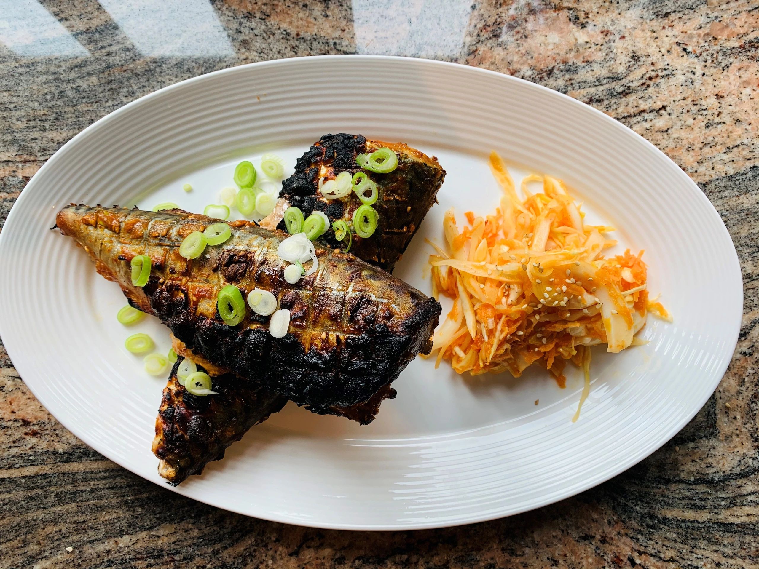 2. In a bowl add all marinade ingredients (half of the spring onions) and mix well. Place mackerel in bowl and baste well and then cover with cling film and refrigerate for up to 120 minutes.